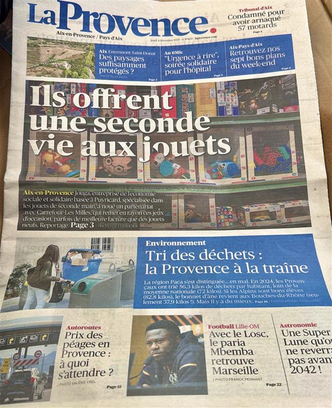 Et ça tombe bien, juste en dessous de la Une, on lit : « Tri des déchets : la Provence à la traîne ». C’est pour cela que nous mettons en place des partenariats avec les centres de tri et Ecomaison pour sauver les #jouets encore en bon état destinés à la destruction. 🤝
