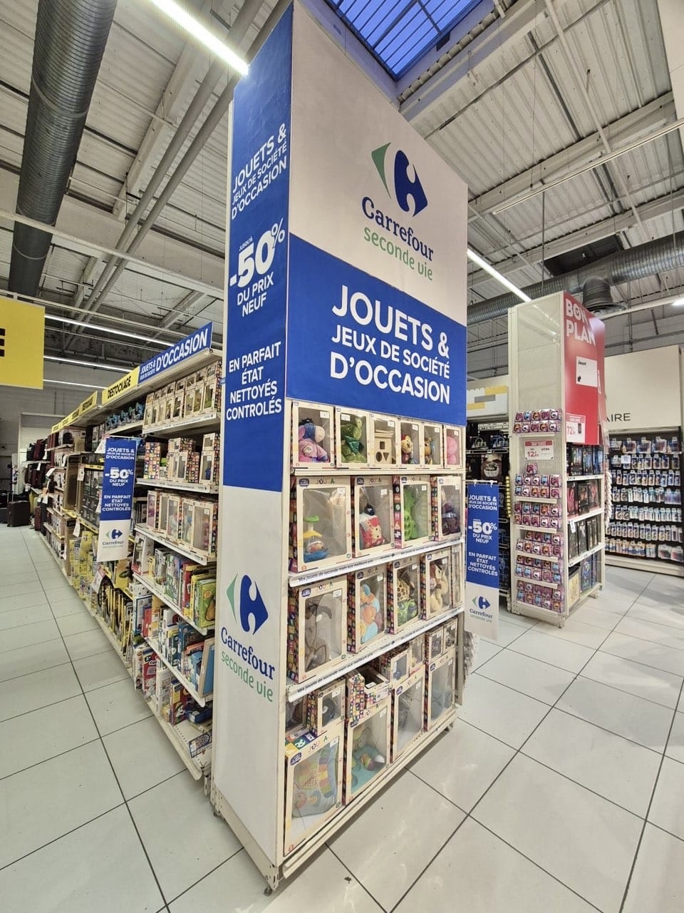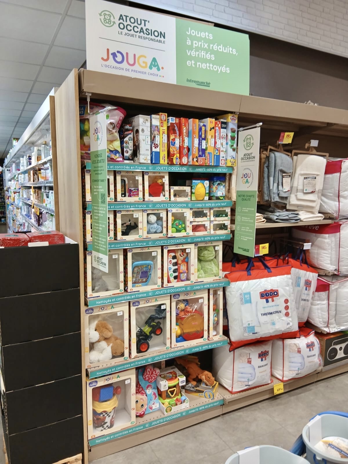 Le rayon jouet de carrefour market Pibrac se transforme avec l’intégration de JOUGA, une solution de jouets d’occasion revalorisés, durable et responsable 🧸♻️